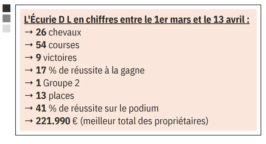 Nassandra Vincennes photo ScoopdygaL’Écurie D L en chiffres entre le 1er mars et le 13 avril : → 26 chevaux → 54 courses → 9 victoires → 17 % de réussite à la gagne → 1 Groupe 2 → 13 places → 41 % de réussite sur le podium → 221.990 € (meilleur total des propriétaires)